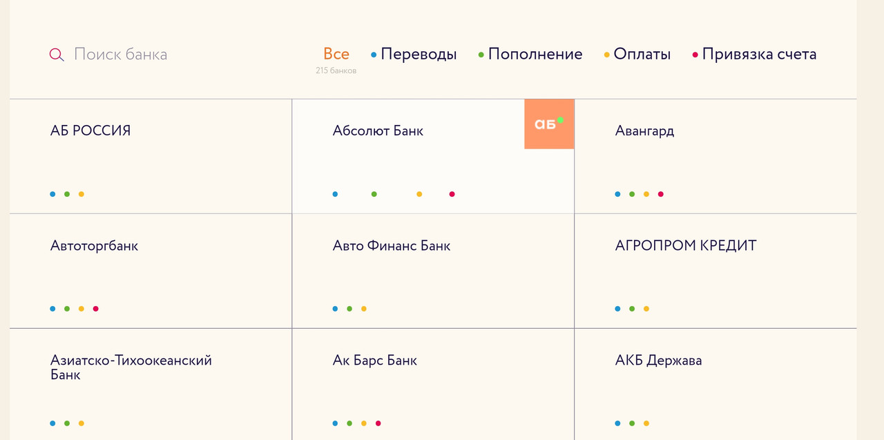 The system includes: Sberbank, VTB, Alfa-Bank, T-Bank (Tinkoff), Otkritie, Gazprombank, Rosbank, PSB, and others. A total of 215 banks.