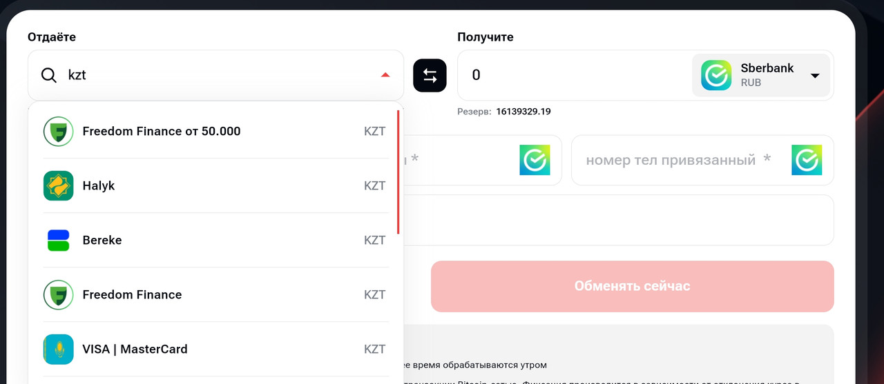 For large transfers, bank systems or e-wallets are convenient, but they often come with high fees. Our online exchange service offers favorable conditions for transferring tenge to rubles, regardless of the amount.
