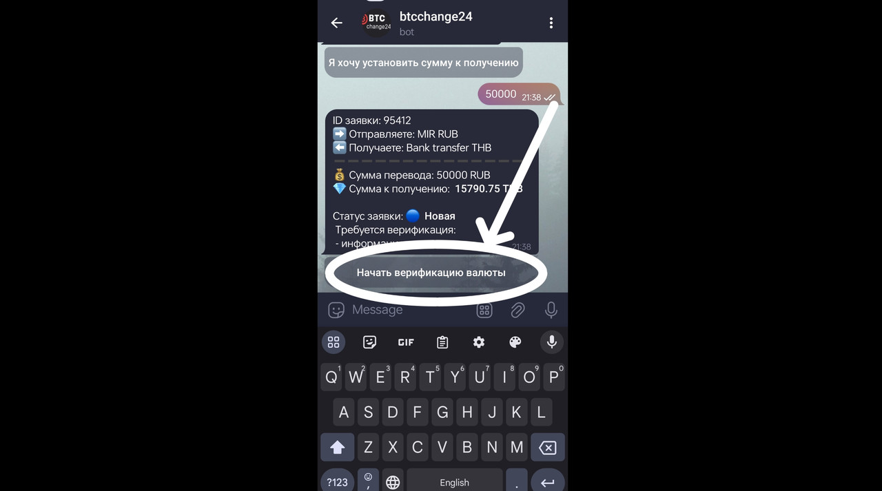 After entering the amount, the bot will provide the following details: number of the order, what you're sending and receiving, transfer amount in RUB, amount to be received in THB, request status and next steps.
