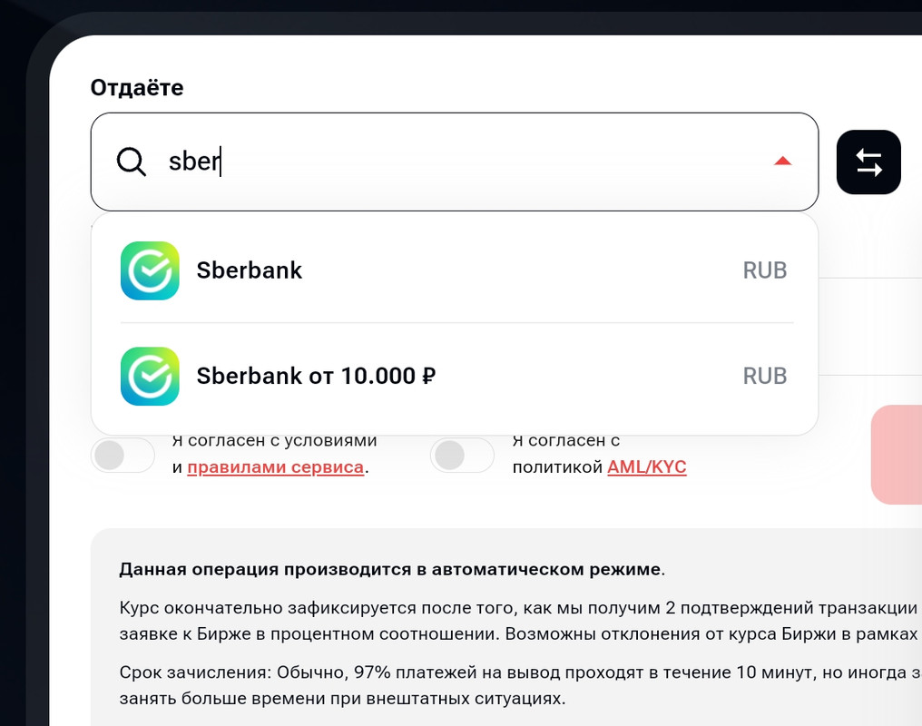 В графе "Отдаёте" доступны следующие способы: