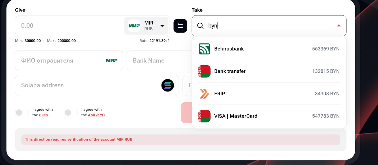 Обменять МИР на белорусский рубль ERIP BYN.