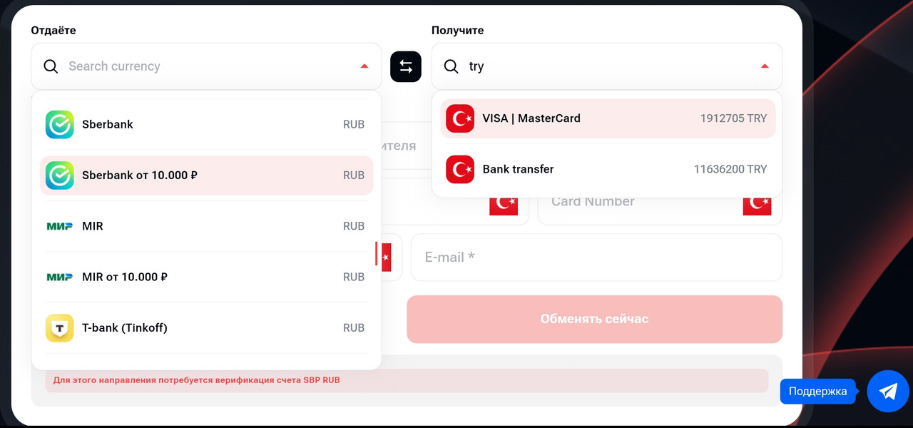 В разделе "Отдаёте" доступны следующие опции: Сбербанк (Sberbank), Т-bank (Тинькофф), Мир (Mir) и СБП (SBP).